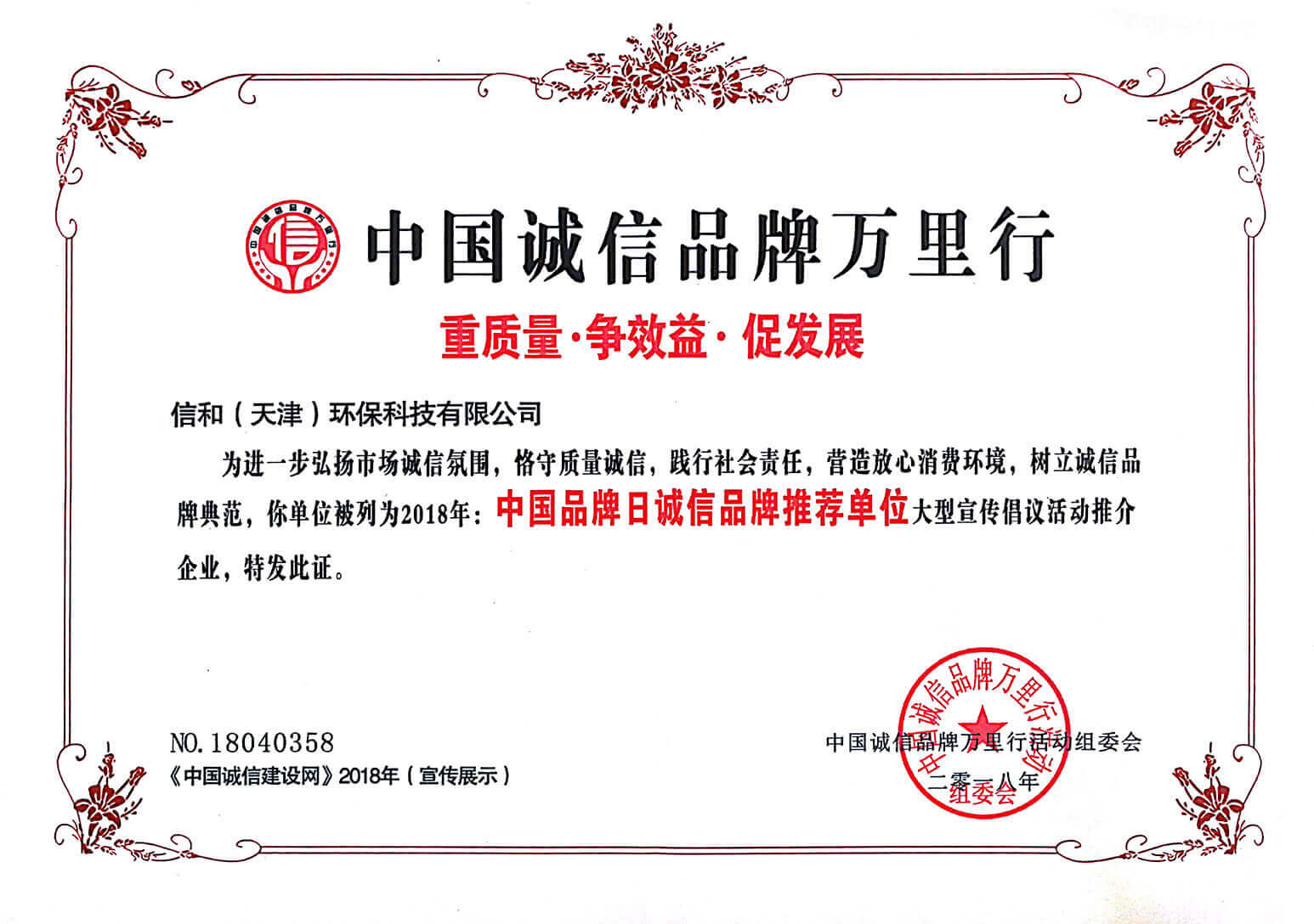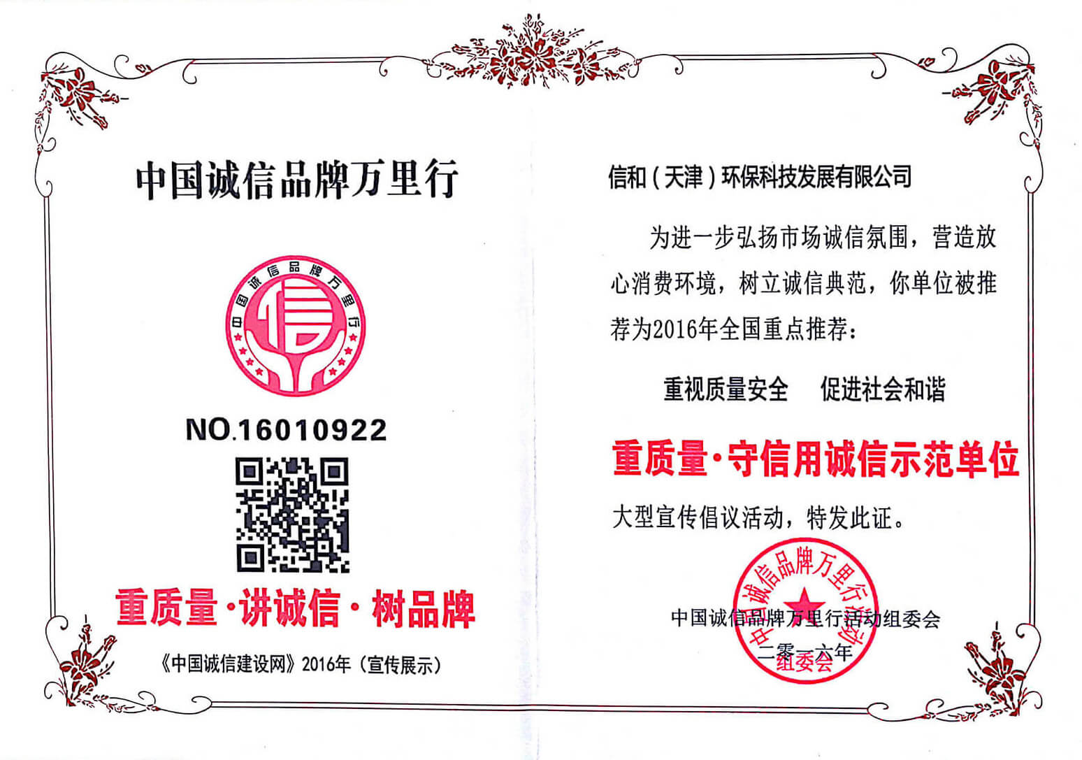 “質(zhì)量就是生命”。信和重質(zhì)量、守信用,被中國(guó)誠(chéng)信品牌萬里行推薦“誠(chéng)信示范單位”、“AAA資信等級(jí)”、“AAA級(jí)誠(chéng)信經(jīng)營(yíng)示范單位”、“誠(chéng)信經(jīng)理人榮譽(yù)證書”、“誠(chéng)信企業(yè)家榮譽(yù)證書”、“中國(guó)產(chǎn)品質(zhì)量放心達(dá)標(biāo)企業(yè)”、“誠(chéng)信品牌聯(lián)盟會(huì)員單位”、“中國(guó)質(zhì)量誠(chéng)信AAA級(jí)品牌企業(yè)”、“中國(guó)百?gòu)?qiáng)優(yōu)秀企業(yè)”、“節(jié)能環(huán)保推廣產(chǎn)品”、“全國(guó)科技創(chuàng)新企業(yè)”等榮譽(yù)稱號(hào)。